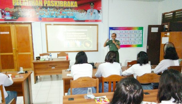SERAMBIJAMBI.ID, TANJAB BARAT – Komandan Kodim 0419/Tanjab yang diwakili Kasdim Mayor Inf Firdaus memberikan materi wawasan kebangsaan kepada Calon Paskibraka Kabupaten Tanjab Barat, bertempat di Diklat BKP-SDM Tanjab Barat, Jum’at (3/8/18). Dengan diikuti 35 orang calon Paskibraka Tanjab Barat.