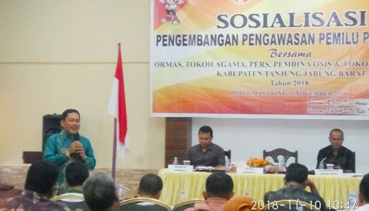 Ketua Bawaslu Tanjab Barat, Hadi Siswa, S.Pd.I saat membuka acara sosialisasi menyebutkan, sosialisasi ini melibatkan berbagai elemen, mulai dari organisasi pemuda dan organisasi masyarakat, tokoh agama dari perwakilan forum kerukunan umat beragama (FKUB), tokoh masyarakat, rekan media, perwakilan parpol, mahasiswa, pembina osis dan pelajar. Hal ini sebagai upaya mendongkrak partisipasi dalam rangka pengawasan Pemilu.