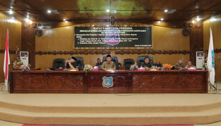 Adapun 2 ( dua ) Rancangan Peraturan Daerah Pemerintah Kab. Tanjung Jabung Barat yang dibacakan oleh Bupati Tanjung Jabug Barat Dr. Ir. H. Safrial, MS tersebut adalah 1. Perubahan atas Perda No. 11 tahun 2011 tentang RPJPD ( Rencana Pembangunan Jangka Panjang Daerah ) Kab. Tanjung Barat tahun 2005-2025. Dan yang ke 2. Perubahan status sebagian wilayah Tebing Tinggi menjadi Desa Ampaian, sebagian wilayah Kelurahan Teluk Nilau menjadi Desa Teluk Nilau Permai, sebagian wilayah Kelurahan Tungkal Harapan menjadi Desa Teluk Pagar, sebagian wilayah Kelurahan Patunas menjadi Desa Berkah Sekumpul, sebagian wilayah Kelurahan Kampung Nelayan menjadi Desa Pantai Pesisir dan perubahan status Kelurahan Sungai Nibung menjadi Desa Sungai Nibung.