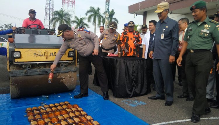 “Kemudian pemusnahan barang bukti ratusan botol miras tersebut dihancurkan dengan cara digilas alat berat dan untuk petasan di rendam ke dalam air serta untuk tuak dibuang ke dalam selokan.