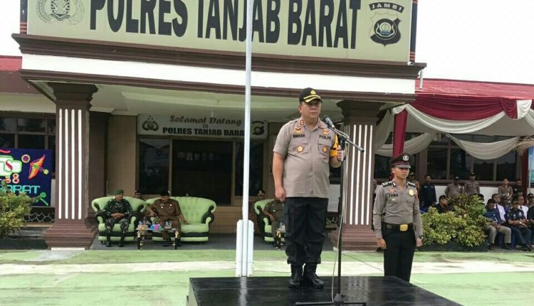 SERAMBIJAMBI.ID, TANJAB BARAT – Kapolres Tanjab Barat AKBP ADG Sinaga, S.IK memimpin Upacara memperingati Hari Ulang Tahun Satuan Pengamanan (HUT-SATPAM) ke-38 tahun 2018, Senin, (31/12/18) Upacara ini digelar di Lapangan Mapolres Tanjab Barat.