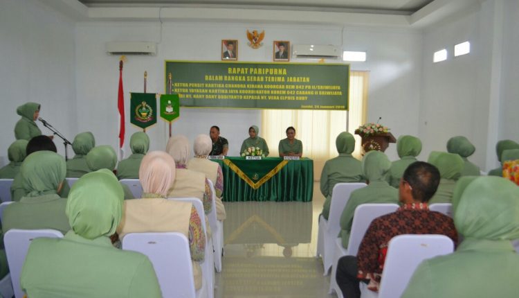 SERAMBIJAMBI.ID, JAMBI – Berkaitan dengan kegiatan serah terima jabatan Komandan Komando Resor Militer 042/Gapu dari Kolonel Inf Dany Budiyanto, S.E kepada Kolonel Arh Elphis Rudi, M.Sc., S.S. yang direncanakan akan dilaksanakan di Makodam II/Sriwijaya Palembang, tanggal 26 Januari 2019. Segenap pengurus Persit Koorcabrem 042 melaksanakan rapat paripurna dalam rangka Sertijab Ketua Persit Kartika Chandra Kirana Koorcabrem 042 PD II/Sriwijaya dan Ketua Yayasan Kartika Jaya Koordinator Korem 042 Cabang II Sriwijaya dari Ny. Nany Dany Budiyanto kepada Ny. Vera Elphis Rudy, bertempat di ruang data Makorem 042/Gapu, Kamis (24/1/19).