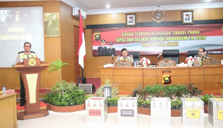 SERAMBIJAMBI.ID, JAMBI – Panitia Daerah (Panda) Polda Jambi menggelar tahapan akhir dari rangkaian kegiatan seleksi yakni Sidang Kelulusan Tingkat Panda Seleksi Sespimmen dan Sespimma TA. 2019 Polda Jambi, Selasa (12/2/19) Pagi, bertempat di Balai Bhayangkara Siginjai Polda Jambi. Bertindak sebagai Pimpinan Sidang adalah Kapolda Jambi Irjen Pol Drs Muchlis AS, MH.