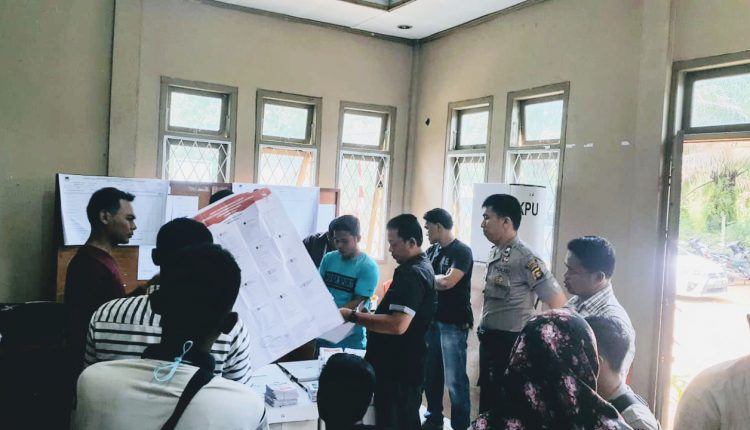 Penghitungan ulang surat suara caleg, disaksikan oleh Ketua Panwascam Nalo Tantan, Ketua PPK Nalo Tantan, dan petugas keamanan dari Kepolisian Resort Merangin.