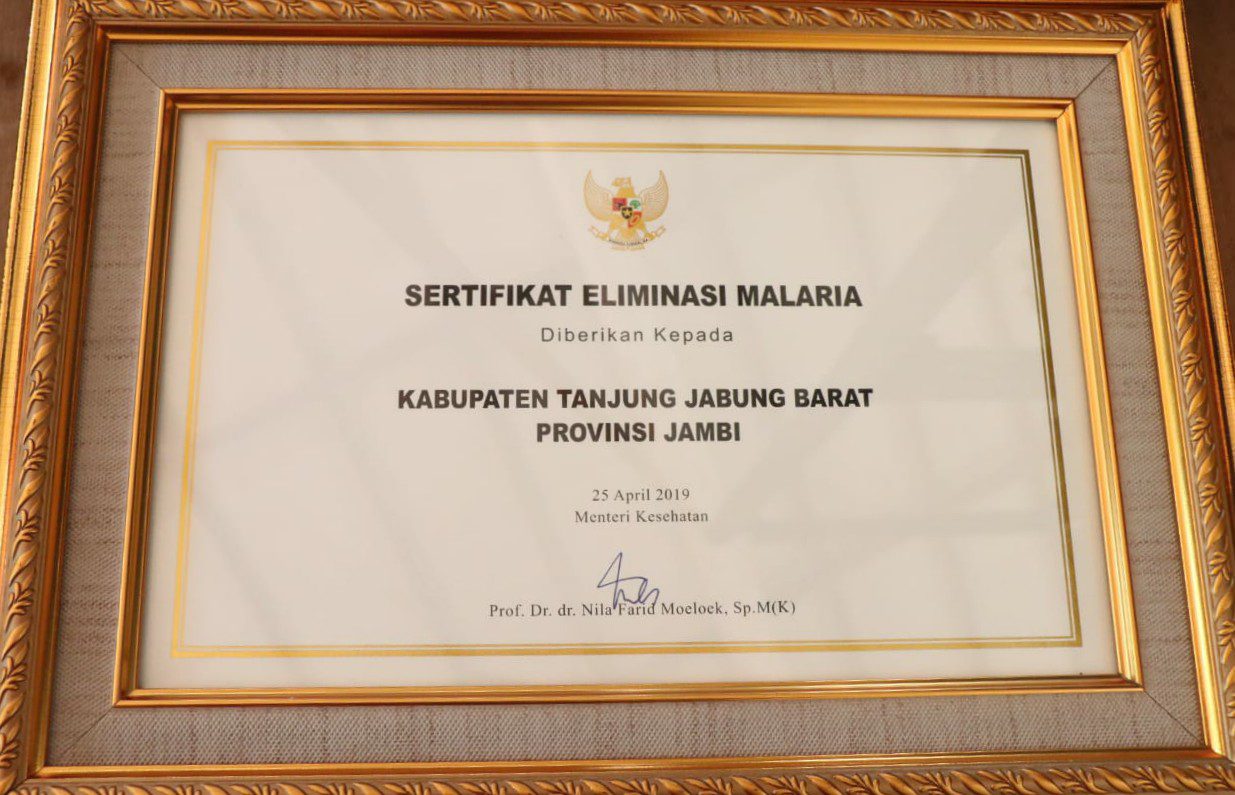 Pemkab Tanjab Barat Terima Penghargaan “Sertifikat Eliminasi Malaria” dari Menteri Kesehatan RI