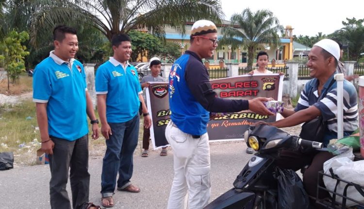 SERAMBIJAMBI.ID, TANJAB BARAT – Momen bulan suci Ramadhan 1440 H, dimanfaatnya oleh Komunitas Ershi Tanjab Barat (Alumni Dikmaba Polri Ta.2001) berbagi Takjil (makanan ringan pembuka puasa) kepada masyarakat dan para pengguna jalan yang melintas di jalan Teluk Nilau Kecamatan Pengabuan Kabupaten Tanjab Barat, Senin (27/5/19)