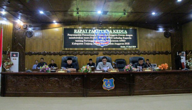 SERAMBIJAMBI.ID, TANJAB BARAT – Menindaklanjuti atas penyampaian Nota Pengantar Pertanggungjawaban APBD 2018 Pemkab Tanjab Barat pada rapat paripurna pertama, kini DPRD kembali gelar Rapat Paripurna Kedua dengan agenda penyampaian pemandangan umum anggota Dewan dengan membawakan suara Fraksi-fraksi DPRD terhadap Raperda tentang pelaksanaan APBD Kabupaten Tanjab Barat anggaran tahun 2018, Senin (17/06/19).