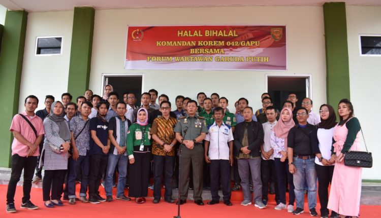 SERAMBIJAMBI.ID, JAMBI – Komandan Korem (Danrem) 042/GAPU Kolonel Arh Elphis Rudy bersama jajaran Korem menggelar Halal Bihalal bersama awak media yang tergabung dalam Forum Wartawan Garuda Putih (Forwagapu), yang bertempat di Makorem, Selasa (18/6/19).