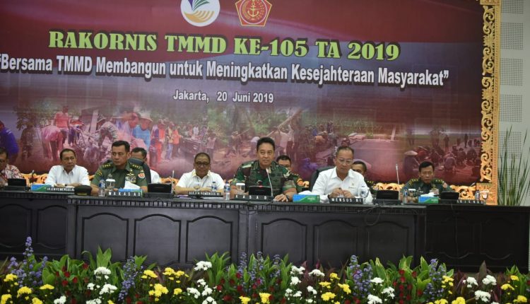 Diungkapkan Kadispenad, dalam rangka mendukung kelancaran pelaksanaan TMMD ke-105 yang akan berlangsung pada triwulan III tahun 2019, Kepala Staf Angkatan Darat (Kasad) Jenderal TNI Andika Perkasa dan Menteri Sosial RI (Mensos) RI Agus Gumiwang membuka Rapat Koordinasi Teknis (Rakornis) Bersama dengan Kementerian Sosial RI dan berbagai unsur pemerintah daerah serta satuan jajaran TNI AD yang terkait.