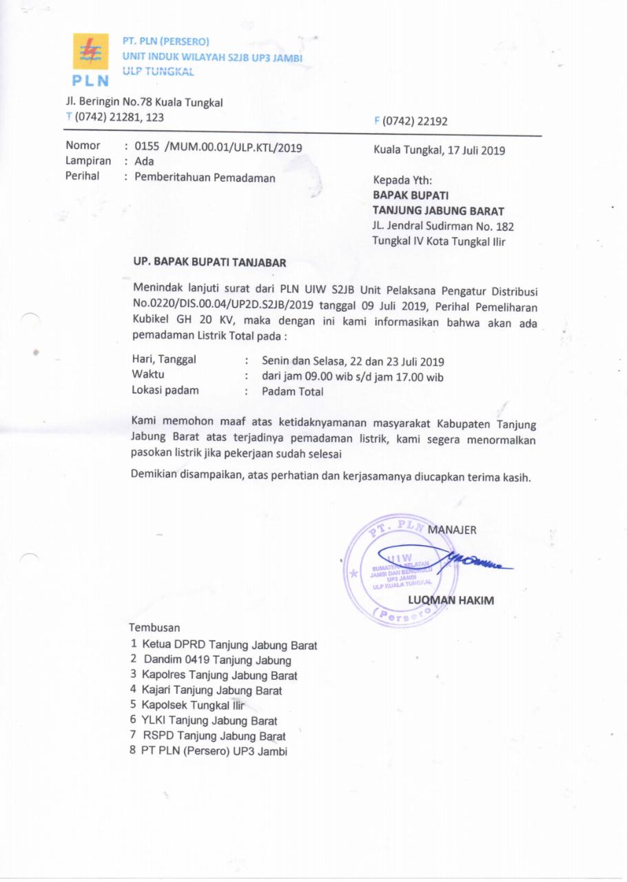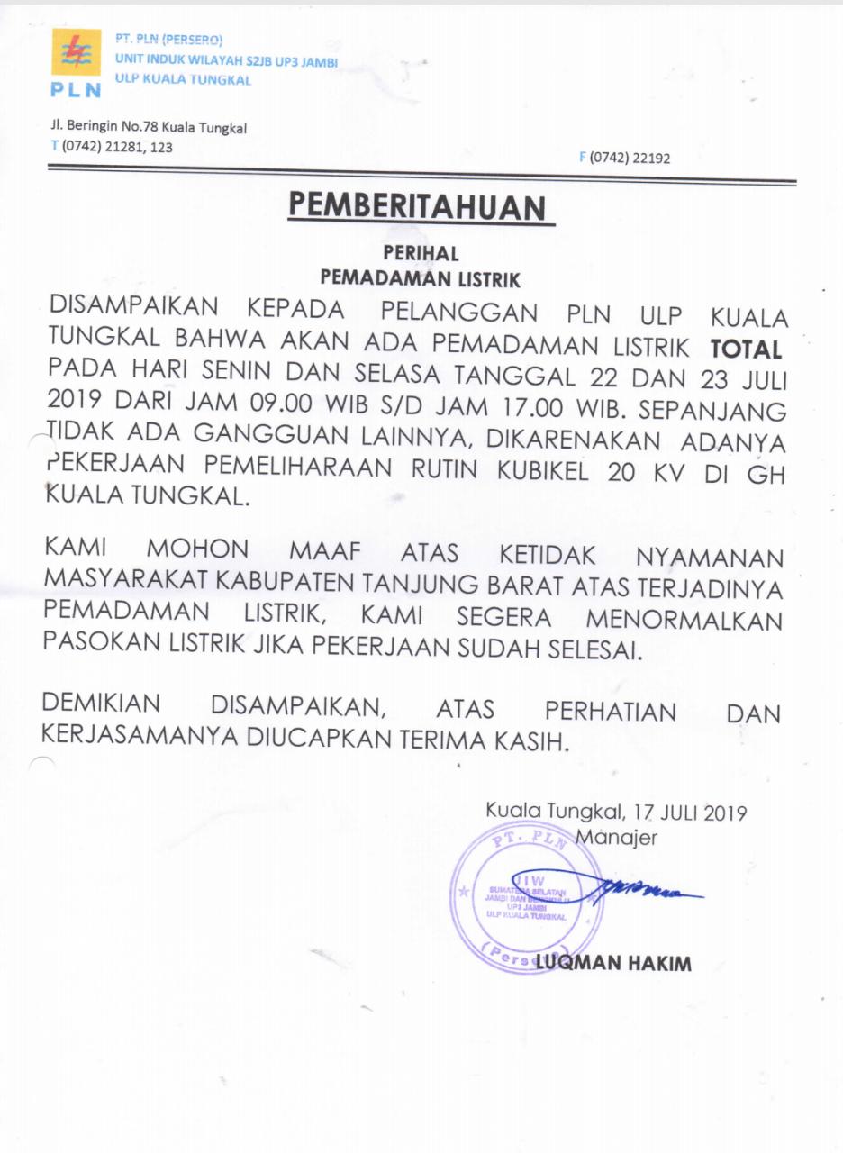 Surat pemberitahuan pemadaman tersebut resmi disampaikan ke Bupati Tanjab Barat, DR. Ir. H. Safrial, MS, tangggal 17 Juli 2019. Surat pemberitahuan pemadaman listrik itu ditandatangani langsung oleh Manajer PLN ULP Kuala Tungkal, Luqman Hakim.