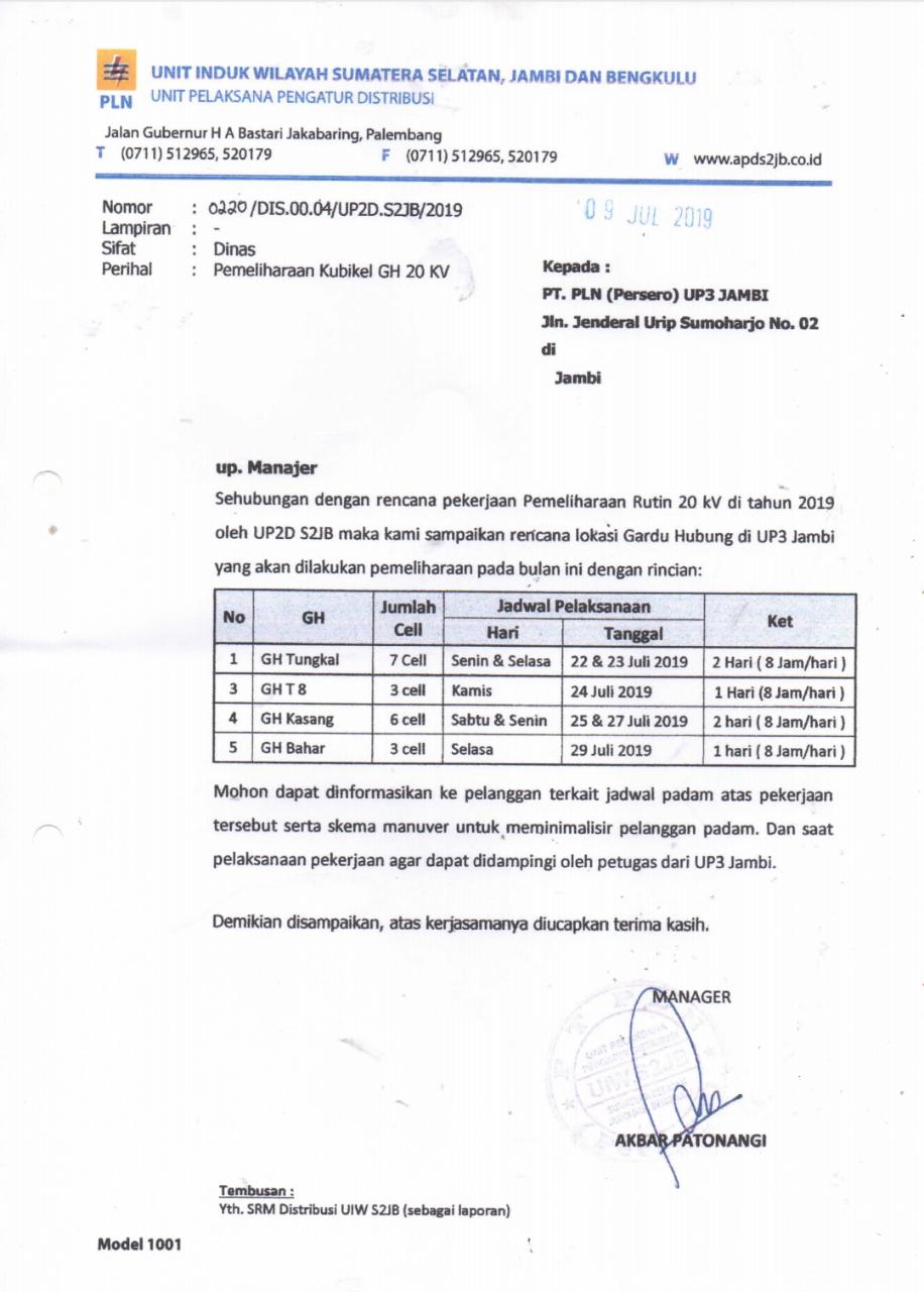 Pemadaman itu dilakukan berdasarkan surat dari PLN UIW S2JB Unit pelaksana Pengatur Distribusi No.0220/DIS.00.04/UP2D.S2JB/2019, tanggal 09 Juli 2019. Perihal Pemeliharaan Kubikel GH 20 Kv.