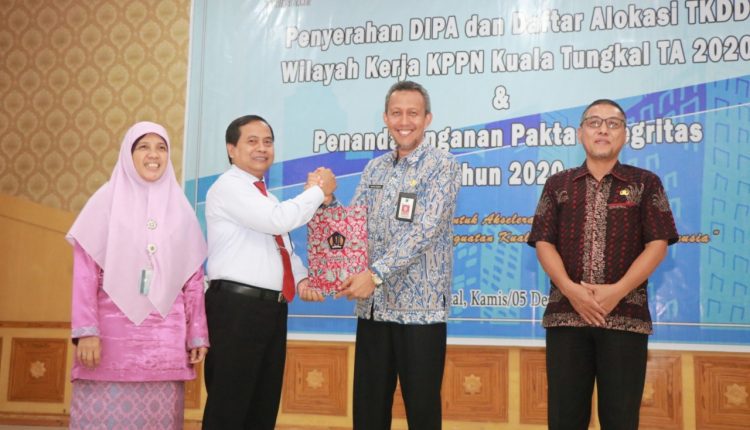 SERAMBIJAMBI.ID, TANJAB BARAT – Pemerintah Kabupaten Tanjung Jabung Barat terima penghargaan atas koordinasi Penyaluran Dana Transfer dan Dana Desa Tahun 2019 dari KPPN Kuala Tungkal yang diterima langsung oleh Sekretaris Daerah Kabupaten H. Agus Sanusi. Penghargaan tersebut diserahkan pada acara penyerahan daftar isian pelaksanaan anggaran (DIPA) dan daftar alokasi Wilayah kerja KPPN kuala Tungkal TA. 2020 dan Penandatanganan Pakta Integritas Tahun 2020, dengan tema yang diangkat “APBN untuk akselerasi daya saing melalui inovasi dan penguatan kualitas sumber daya manusia”, Kamis (05/12/19) bertempat dib alai Pertemuan Kantor Bupati Tanjab Barat.