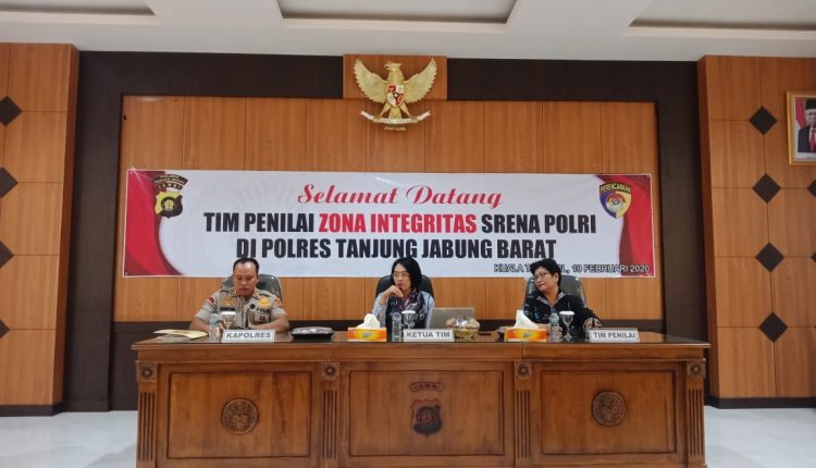SERAMBIJAMBI.ID, TANJAB BARAT – Tim Penilai Internal (TPI) dari Jianalis Ro Biro RBP Srena Polri Kombes Pol Dr. Nur Azizah, S.IK, M.Si didampingi Kasubbag Tuduan Itwasum Polri AKBP Ida Ayu Kadek Someyani, S.IK, dan Kabag RBP Polda Jambi AKBP Dwi Agung Widodo, SE melakukan kunjungan langsung ke Mapolres Tanjab Barat dalam rangka penilaian Zona Integritas menuju Wilayah Bebas Dari Korupsi (WBK) dan Wilayah Bebas Birokrasi Bersih dan Melayani, Rabu (19/2/20).