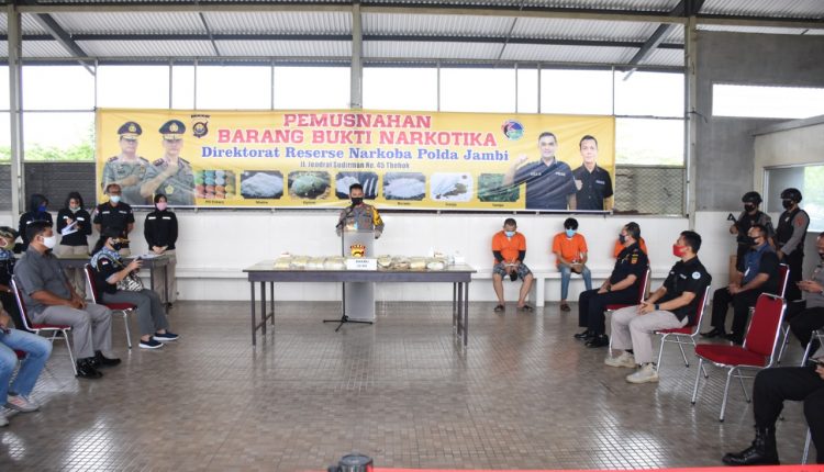 “Pemusnahan ini merupakan salah satu ketentuan hukum yang harus dilakukan penyidik sebagai bagian dari proses penyidikan sekaligus merupakan barang bukti akuntabilitas dan transparansi tugas Polri dalam memperlakukan barang bukti narkoba yang disita dari para tersangka,” ujar Kapolda didampingi Direktur Resnarkoba Polda Jambi Kombes Pol Eka Wahyudianta.