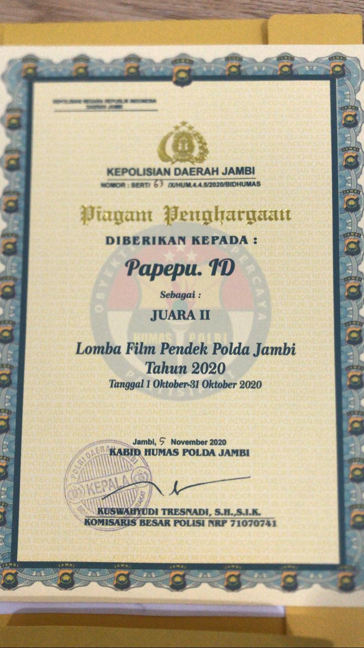 Ega seorang sineas muda Kota Jambi bersama tim yang terdiri dari Muchlis (videographer), Ridho (pemeran utama), Teguh Prasetyo (pemeran pembantu 1) dan Ida (pemeran pembantu 2) yang tergabung didalam Papepu.ID menjuarai lomba Film Pendek yang diselenggarakan oleh Polda Jambi sebagai juara ke dua. (Syah/*)