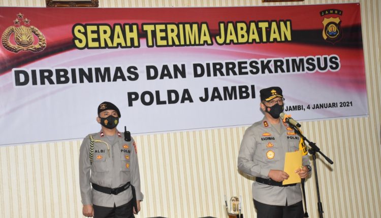 SERAMBIJAMBI.ID, JAMBI – Bertempat diruangan coffe morning Mapolda Jambi, Kapolda Jambi Irjen Pol A Rachmad Wibowo memimpin lansung serah terima jabatan (Sertijab) Dirreskrimsus dan Dirbinmas, Senin (4/1/2021).
