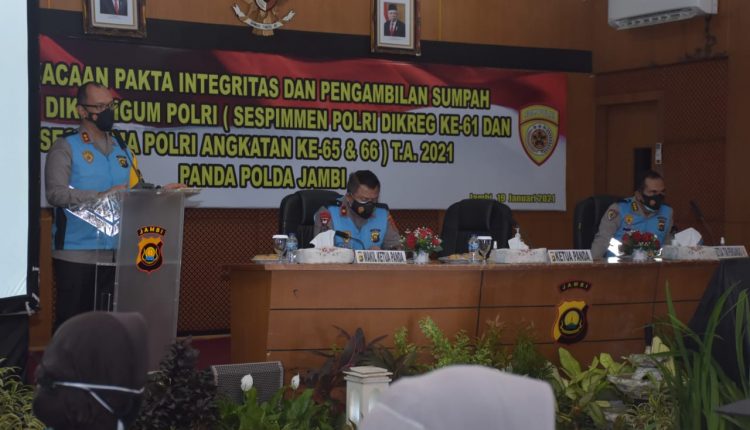 SERAMBIJAMBI.ID – JAMBI – Kapolda Jambi, Irjen Pol. A. Racmad Wibowo, S.I.K., memimpin pengambilan sumpah dan penandatanganan pakta integritas panitia dan peserta seleksi Dikbangum Sespimmen dan Sespimma T.A. 2021, Selasa (19/1).