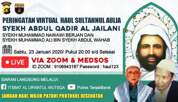 SERAMBIJAMBI.ID, TANJAB BARAT – Peringatan Haul Syekh Abdul Qodir Al-Jailani, Syekh Mohammad Nawawi Berjan, Syekh Muhammad Ali Bin Syekh Abdul Wahab dilaksanakan berbeda dengan tahun-tahun sebelumnya, dikarenakan pandemi Covid-19 kegiatan yang akan dilaksanakan pada 23 Januari 2021 di Pondok Pesantren Al Baqiatush Shalihat Kuala Tungkal akan digelar secara virtual melalui Zoom Meeting, Live Youtube dan Facebook.