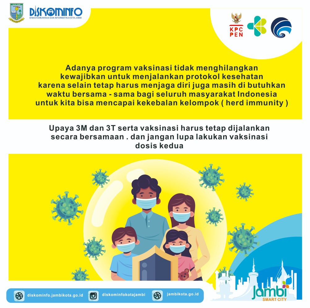 Ingat ya! Adanya program vaksinasi yang telah berjalan saat ini, tak lantas membuat kita lengah menjalankan protokol kesehatan. Sebaliknya, proses vaksinasi harus paralel dengan pelaksanaan 3M. Jaga diri dan jaga keluarga kita.