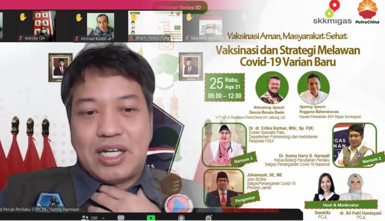 Demikian disampaikan Ketua Bidang Perubahan Perilaku Satuan Tugas Penanganan Covid-19 Nasional, Sonny Harri B. Harmadi pada webinar yang digelar SKK Migas – PetroChina International Jabung Ltd., Rabu (25/8/2021). Sonny Harri B. Harmadi menekankan pentingnya perubahan perilaku masyarakat dalam menghadapi pandemi.