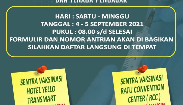 “Pelayanan vaksinasi untuk pelajar dan tenaga pengajar dijadwalkan pada Sabtu dan Minggu (4 dan 5 September 2021) yang dilaksanakan di dua sentra vaksinasi, yakni Yello Hotel kompleks Transmart Jambi dan Ratu Convention Center. dengan demikian, pelaksanaan vaksinasi tidak mengganggu waktu belajar daring para pelajar, ” ujar Irjen Pol A Rachmad Wibowo, Jumat (3/9/21).
