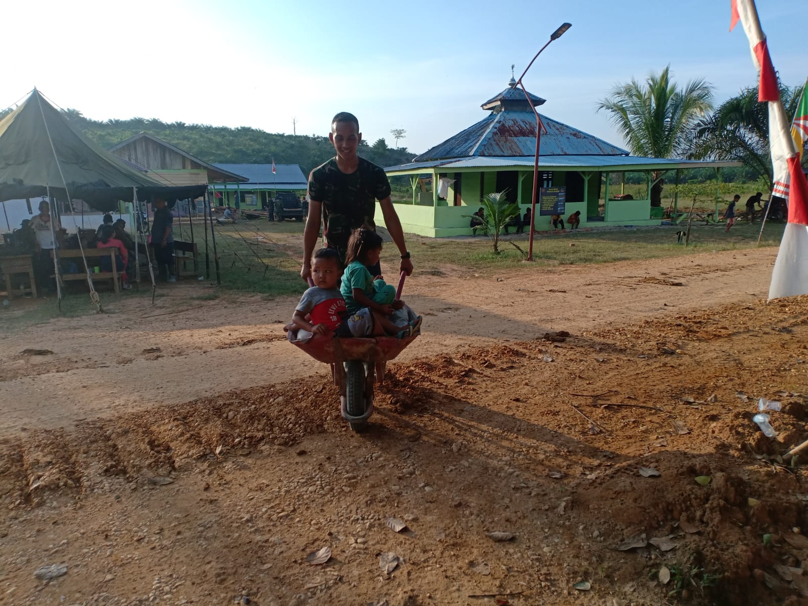 SERAMBIJAMBI.ID, TEBO – Menjelang berakhirnya kegiatan TMMD ke -112 Kodim 0416/Bungo Tebo, Prada M Irfan ikut menyenangkan hati adik asuh bermain gerobak sorong usai bekerja seharian di RT 17 simpang semangko, Kelurahan Sungai Bengkal, kecamatan Tebo Ilir, Jumat (08/10/2021).