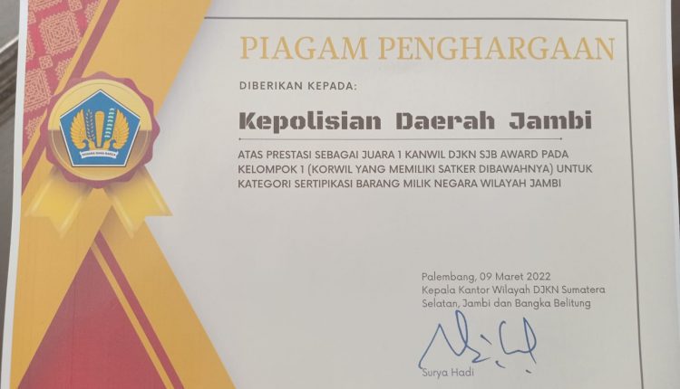 SERAMBIJAMBI.ID, JAMBI – Polda Jambi menerima penghargaan dari Direktorat Jenderal Kekayaan Negara DJKN) Provinsi Sumatera Selatan, Jambi, dan Bangka Belitung (SJB) Kementerian Keuangan Republik Indonesia atas prestasi sebagai juara 1 Kanwil DJKN SJB Award pada kelompok 1 (Korwil yang memiliki satker dibawahnya) untuk kategori sertipikasi Barang Milik Negara wilayah Jambi pada Rabu, (09/03/2022).