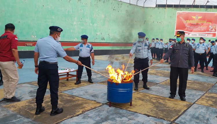 Pemusnahan Handphone (HP) milik narapidana tersebut dengan cara dimasukan ke tong besi lalu dibakar.