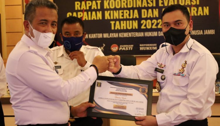 SERAMBIJAMBI.ID, MUARA SABAK – Lembaga Pemasyarakatan (Lapas) Narkotika Kelas IIB Muara Sabak menerima Penghargaan Satuan Kerja Dengan Nilai Kinerja Terbaik Ke 3 Melalui Aplikasi SMART Di Lingkungan Kanwil Kemenkumham Jambi Tahun Anggaran 2021, Rabu (30/3/22).