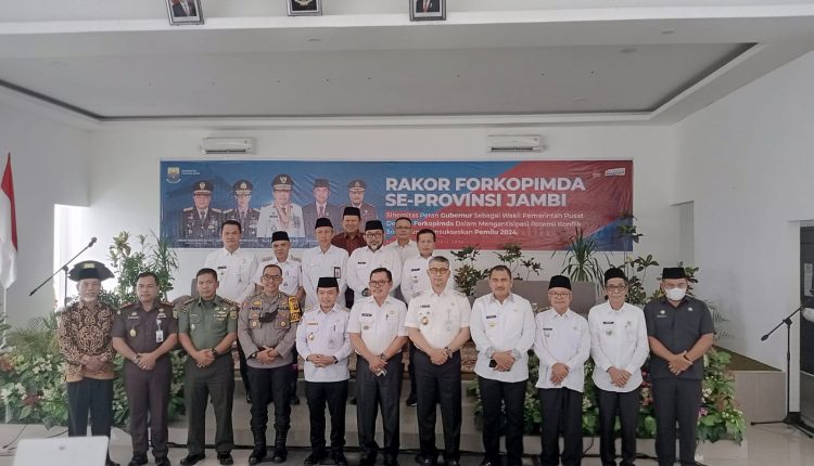 Rakor yang bertemakan Koordinasi Sinergitas Peran Gubernur sebagai Wakil Pemerintah Pusat dengan Forkopimda dalam Mengantisipasi Potensi Konflik guna Menyukseskan Pemilu 2024 Provinsi Jambi Tahun 2024 .