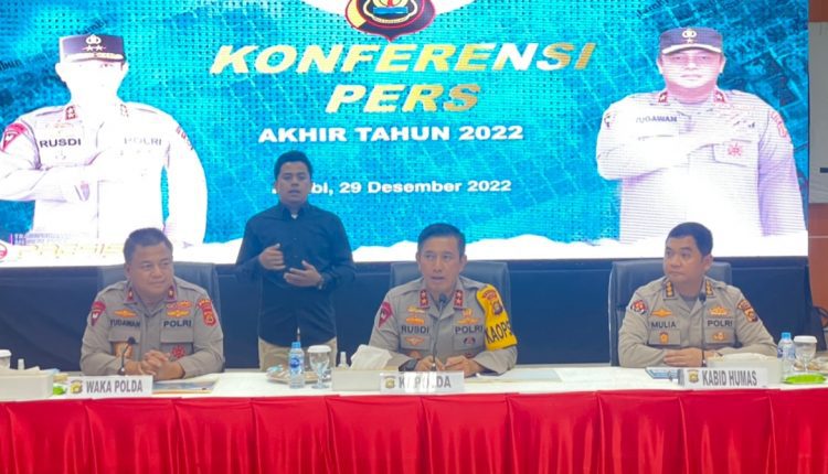 SERAMBIJAMBI.ID, JAMBI – Kepolisian Daerah Jambi menggelar konferensi pers akhir tahun bertempat di Aula lantai IV Mapolda Jambi yang dipimpin langsung oleh Kapolda Jambi Irjen Pol Drs Rusdi Hartono didampingi Wakapolda Jambi Brigjen Pol Drs Yudawan R, Kabid Humas Kombes Pol Mulia Prianto, dan Pejabat Utama Polda Jambi, Kamis (29/12/22).