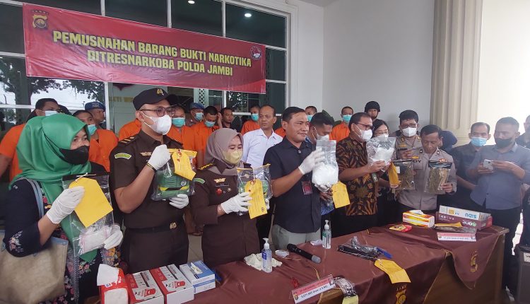 SERAMBIJAMBI.ID, JAMBI – Ditresnarkoba Polda Jambi melakukan pemusnahan barang bukti narkoba 5,07 kilogram sabu dan 0,61 kilogram ganja dari penangkapan 10 tersangka.