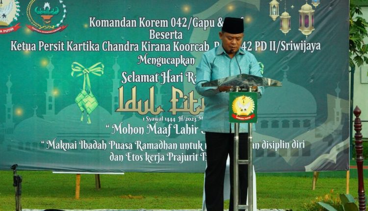 Gelar Sholat Idul Fitri 1444 H di Lapangan Makorem 042 Gapu, Brigjen TNI Supriono: Minal Aidin Wal Fa Izin