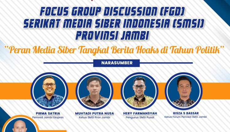 Terpisah, Ketua SMSI Provinsi Jambi Mukhtadi Putra Nusa menyebutkan, kegiatan FGD ini mengangkat tema Peran Media Siber Tangkal Berita Hoaks di Tahun Politik yang mana diikuti sebanyak 25 peserta dari wartawan masing-masing media online anggota SMSI yang ada di Kota Jambi.