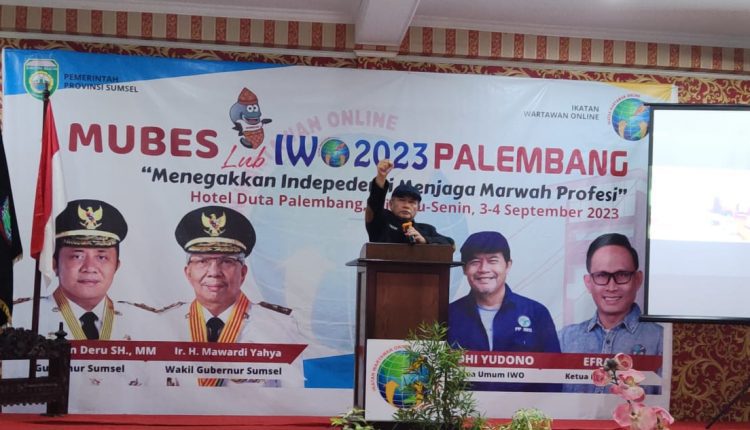 SERAMBIJAMBI.ID, PALEMBANG – Musyawarah Bersama Luar Biasa (Mubeslub) Ikatan Wartawan Online (IWO) tahun 2023 secara resmi telah dibuka oleh Ketua Umum Pimpinan Pusat IWO Jodhi Yudono, Minggu (03/09/2023) sore di Hotel Duta, Kota Palembang.