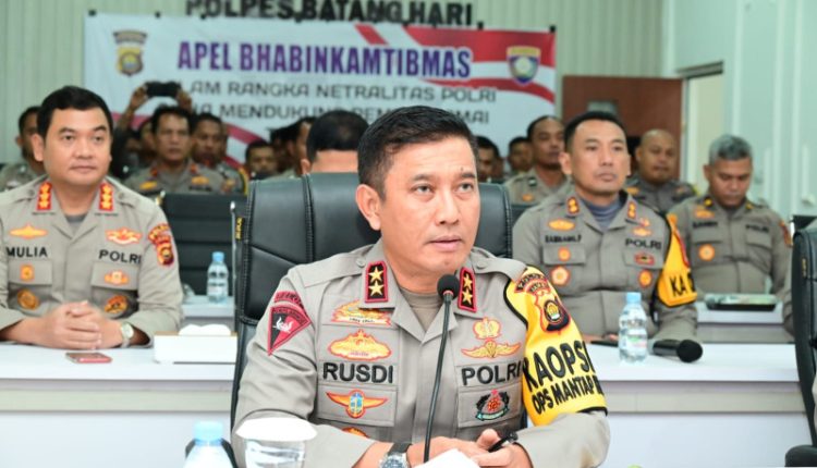 SERAMBIJAMBI.ID, JAMBI – Kapolda Jambi Irjen Pol Rusdi Hartono memimpin Apel Bhabinkamtibmas dan Arahan dalam rangka netralitas Polri guna mendukung Pemilu 2024 Aman dan damai secara daring di Mapolres Batanghari, Rabu (16/11/2023).