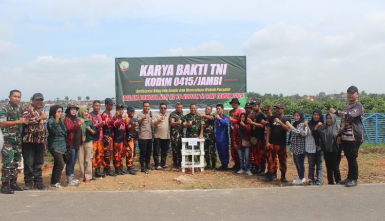 SERAMBIJAMBI.ID, JAMBI – Dandim 0415 Jambi Letkol Arm Eko Pristiono memimpin langsung Karya Bhakti Penanaman pohon bersama gabungan TNI-Polri, Pemkot Jambi, Mahasiswa, Pramuka, Ormas dan elemen masyarakat berlangsung di Bantaran Sungai Batanghari belakang Pasar Angso Duo Jl. Sultan Thaha Kelurahan Legok Kecamatan Telanaipura Kota Jambi Jumat, 08/12/2023 pagi.