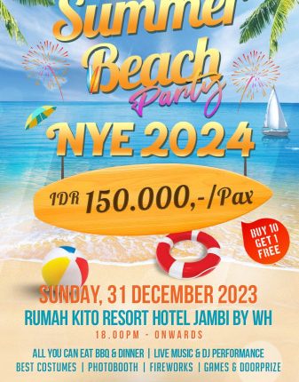 Libur akhir tahun menjadi moment paling berharga bersama keluarga dan orang terkasih untuk menutup tahun dan menyambut tahun yang baru, Rumah Kito Resort Hotel Jambi by WH menjadi pilihan untuk dinner malam tahun baru karna kali ini Rumah Kito Resort Hotel Jambi by WH Mengusung tema yang bertajuk Summer Beach Party New Year 2024 dengan harga Idr 150.000nett/pax Buy 10 Get 1 Free pada 31 Desember 2023 mulai dari jam 18.00 – selesai.