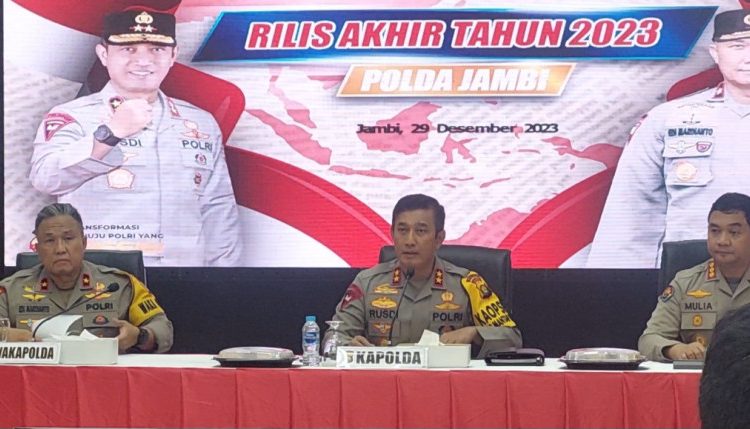 SERAMBIJAMBI.ID, JAMBI – Kepolisian Daerah (Polda) Jambi menggelar press release akhir tahun dalam rangka penyampaian kinerja serta evaluasi dan keberhasilan Polda Jambi selama tahun 2023 yang dipimpin langsung Kapolda Jambi Irjen Pol Rusdi Hartono didampingi Wakapolda Brigjen Pol Edi Mardianto, Kabid Humas Kombes Pol Mulia Prianto, dan Pejabat Utama Polda Jambi bertempat di Aula Lantai IV Mapolda Jambi, Jum’at (30/12/23).
