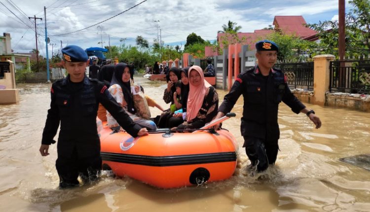 Kompi 3 Batalyon B Pelopor Satbrimob Polda Jambi terus memberikan bantuan kepada masyarakat yang terdampak banjir, dengan menggunakan peralatan milik Satbrimob Polda Jambi seperti perahu karet digunakan untuk mengevakuasi masyarakat.