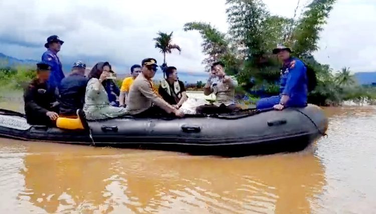 Kapolres Kerinci AKBP M. Mujib didampingi oleh Wakapolres, Kabag Ops Polres Kerinci Kompol S. Nababan turun langsung mengunakan perahu karet memantau dan memberikan bantuan kepada masyarakat terdampak bencana banjir.