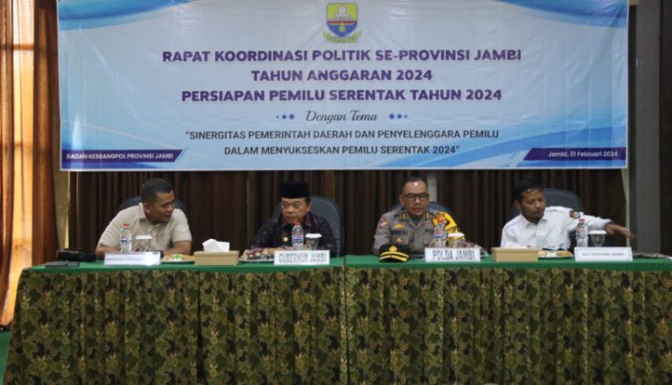 SERAMBIJAMBI.ID, JAMBI – Dalam rangka menyukseskan Pemilu 2024, Badan Kesatuan Bangsa dan Politik (Kesbangpol) Provinsi Jambi menyelenggarakan Rapat Koordinasi Politik Se-Provinsi Jambi pada tahun anggaran 2024 Persiapan Pemilu Serentak tahun 2024. Rakor Politik ini mengusung tema “Sinergitas Pemerintah Daerah dan Penyelenggara Pemilu dalam menyukseskan pemilu serentak 2024”, bertempat di Golden Harvest Hotel, Kamis (01/02/2024).
