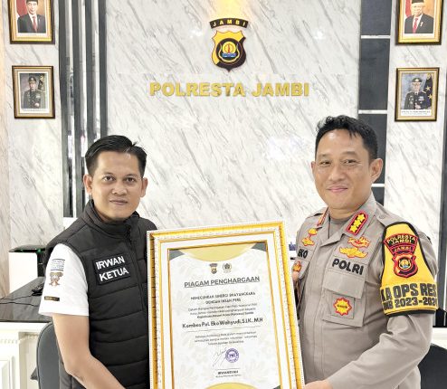 SERAMBIJAMBI.ID, JAMBI – Momen peringatan Hari Pers Nasional (HPN) tahun 2024 yang jatuh pada tanggal 09 Februari, Kapolresta Jambi Kombes Pol Eko Wahyudi, SIK, MH menerima penghargaan dari Ketua Persatuan Wartawan Indonesia (PWI) Kota Jambi Irwansyah.