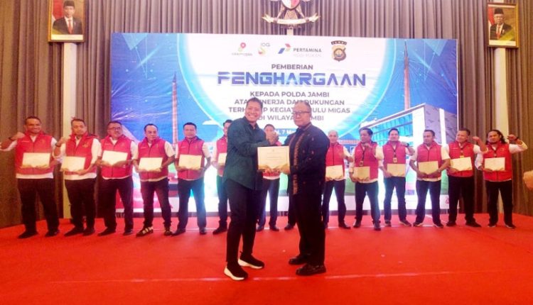 SERAMBIJAMBI.ID, JAMBI – Direktorat Reserse Kriminal Umum (Ditreskrimum) Kepolisian Daerah (Polda) Jambi menerima penghargaan dari SKK Migas KKKS PHE Jambi Merang atas keberhasilan pengungkapan tindak pidana ilegal tapping kondensat di jalur pipa KKKS Pertamina Hulu Energi Jambi Merang (PHE Jambi Merang) yang terjadi di KM pipa 85 SKN-GF Rantau Raya Kecamatan Geragai Kabupaten Tanjung Jabung Timur Provinsi Jambi.