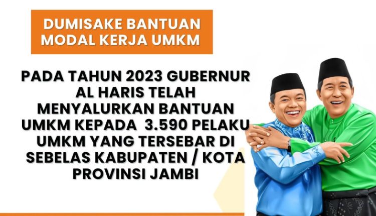 Bantuan modal kerja yang merupakan bagian realisasi dari Dumisake Jambi Mantap ini nilainya mencapai Rp 37,280 Miliar. Dibagikan selama 2 tahun berturut, dimana tahun 2022 dengan realisasi Dumisake UMKM sebesar Rp 19,330 miliar dan tahun 2023 dengan realisasi Rp. 17,950 miliar.