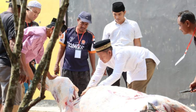 Kapolres Tanjab Barat AKBP Agung Basuki, S.IK, MM, bahkan hadir langsung memimpin proses penyembelihan dan pemotongan hewan kurban.