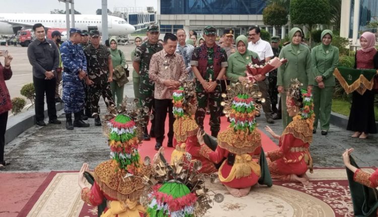 Seremoni penyambutan di Bandara Sultan Thaha Kota Jambi dipenuhi dengan kehangatan budaya Melayu Jambi, di mana Pangdam II/Sriwijaya dan Ketua Persit KCK Daerah II/Sriwijaya Ibu Rika Naudi Nurdika menerima pengalungan syal dan handbuket dari bujang gadis penari sekapur sirih.