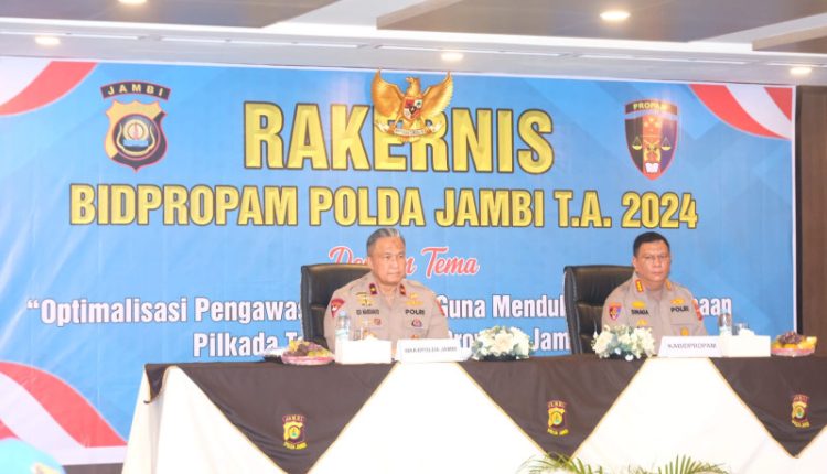 SERAMBIJAMBI.ID, JAMBI – Wakapolda Jambi Brigjen Pol. Edi Mardianto didampingi oleh Kabid Propam Polda Jambi Kombes Pol. ADG. Sinaga membuka kegiatan Rakernis Bidang Propam T.A. 2024 Polda Jambi, Senin, (8/7/24)