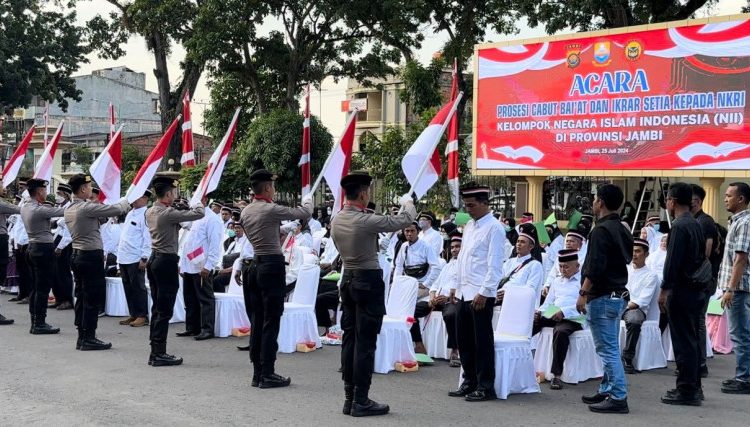 SERAMBIJAMBI.ID, JAMBI – Sebanyak 234 orang dari berbagai daerah di Provinsi Jambi yang diduga terafiliasi dengan kelompok Negara Islam Indonesia (NII) melakukan Cabut Baiat dan Ikrar Setia kepada NKRI.