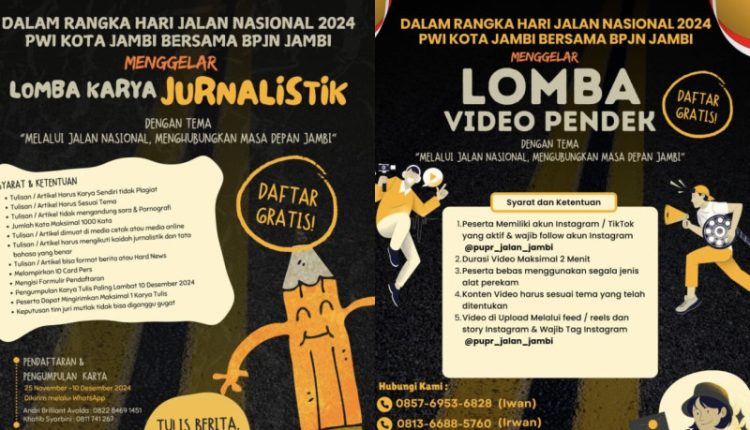 Kegiatan tersebut dalam rangka menyambut Hari Jalan Nasional 2024 dengan penuh kebersamaan yang mana Wartawan dan Masyarakat umum dipanggil untuk ikut bersama merayakan lomba ini yang bertemakan “Melalui Jalan Nasional, Menghubungkan Masa Depan Jambi”. Pendaftaran gratis alias tidak dipungut biaya, berkas digital dikirimkan melalui narahubung yang telah ditunjuk.